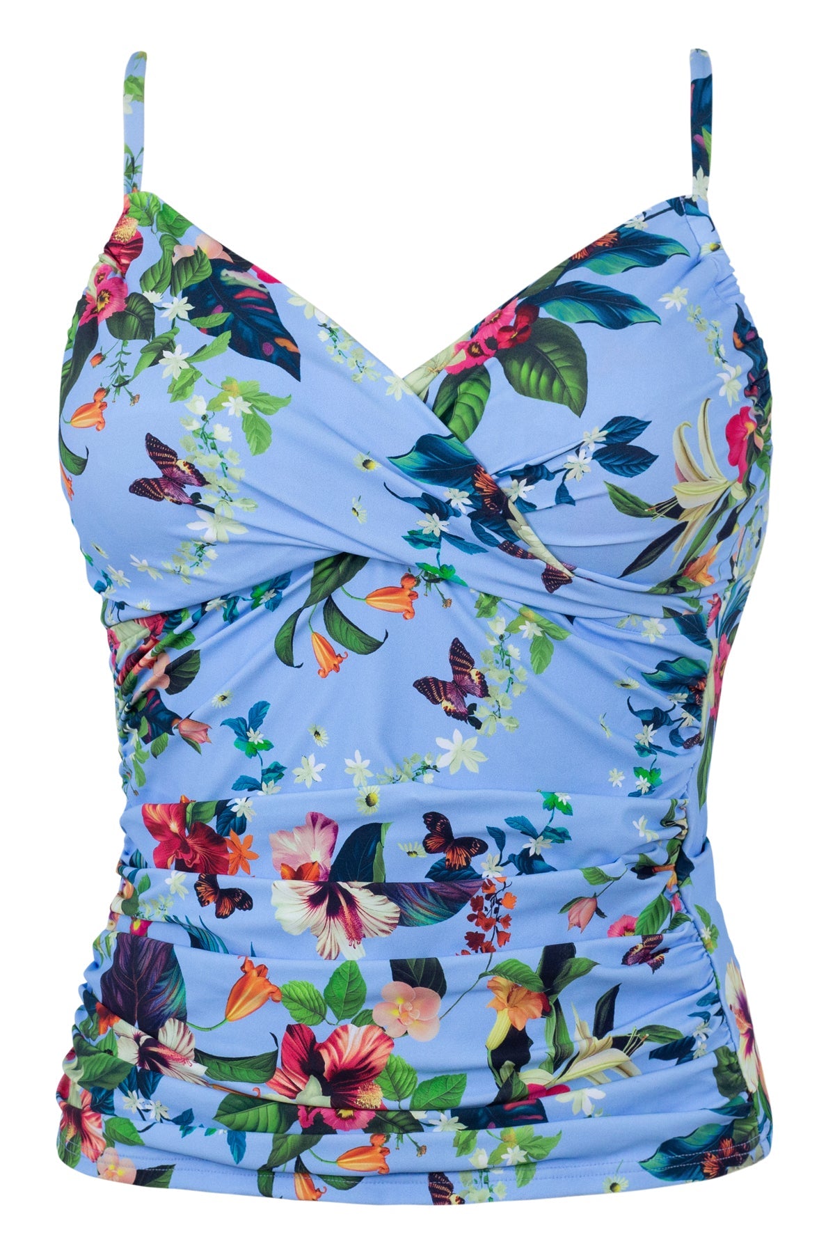 The Simone Tankini is sleek and sophisticated. With shirring along the sides and a flattering crossover neckline, this tankini is a summer staple! Features include removable cups and over-the-shoulder adjustable straps that can be converted to a crossback.